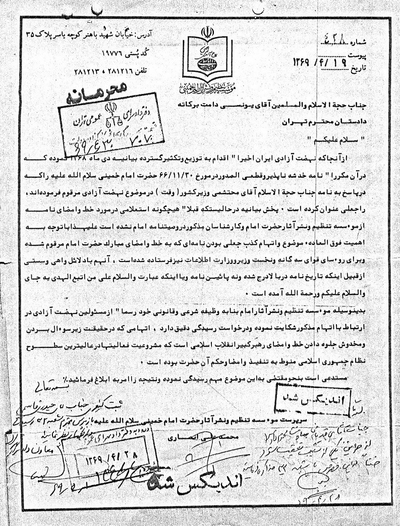 19 تیرماه 69 محمدعلی انصاری، سرپرست مؤسسه تنظیم و نشر آثار امام خمینی در نامهای به حجتالاسلام یونسی، دادستان تهران با اشاره به اینکه «نهضت آزادی ایران اخیراً اقدام به توزیع و تکثیر گسترده بیانیه دی ماه 68 نموده» مبنی بر جعلی بودن نامه امام مینویسد: «بدینوسیله مؤسسه تنظیم و نشر آثار امام بنا به وظیفه شرعی و قانونی خود رسماً از مسئولین نهضت آزادی در ارتباط با اتهام مذکور شکایت نموده و درخواست رسیدگی دقیق دارد». این نامه بهمثابه شکایت رسمی مؤسسه تلقی شده و با دستور معاون دادستان، شعبه 32 دادسرای عمومی تهران موظف به رسیدگی به این شکایت میشود.