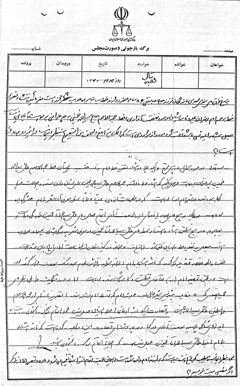 لذا از آنجا که اینجانب از سوابق و اسناد مربوط به ارتباطات نهضت و رهبران آن و وابستگی بینش سیاسی آنان با آمریکای جهانخوار، این دشمن اسلام و بشریت و ملت ایران، مطلع میباشم و در همین رابطه در بهمن ماه سال 1366 شخصاً از رهبر کبیر انقلاب اسلامی حضرت امام خمینی قدس سره راجع به صلاحیت فعالیت گروهک بهاصطلاح نهضت آزادی استفسار کردم تا تکلیف مقامات جمهوری اسلامی بهخصوص در امر انتخابات روشن گردد، لذا بدینوسیله بهاطلاع میرسانم که: