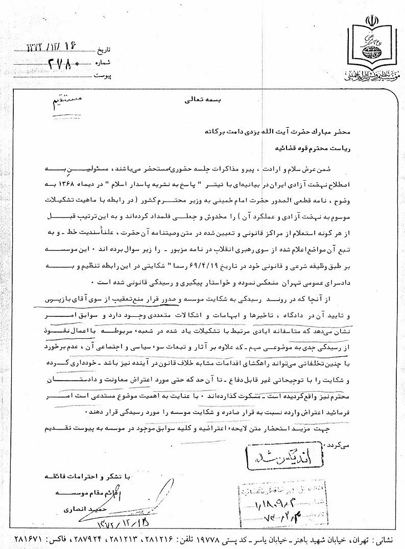 15 اسفند 72 آقای انصاری نامهای خطاب به آیتالله یزدی، رئیس قوه قضائیه مینویسد که روند رسیدگی را وارد فاز جدیدی میکند. در بخشی از این نامه آمده است: «از آنجا که در روند رسیدگی به شکایت مؤسسه و صدور قرار منع تعقیب از سوی آقای بازپرس و تأیید آن در دادگاه، تأخیرها و ابهامات و اشکالات متعددی وجود دارد و سوابق امر نشان میدهد که متأسفانه ایادی مرتبط با تشکیلات یادشده در شعبه مربوطه با اعمال نفوذ از رسیدگی جدی به موضوعی مهم ــ که علاوه بر آثار و تبعات سوء سیاسی و اجتماعی آن، عدم برخورد با چنین تخلفاتی میتواند راهگشای اقدامات مشابه خلاف قانون در آینده نیز باشد ــ خودداری کرده و شکایت را با توجیهاتی غیرقابل دفاع ــ تا آن حد که مورد اعتراض معاونت و دادستان محترم نیز واقع گردیده است ــ مسکوت گذاردهاند. با عنایت به اهمیت موضوع مستدعی است امر فرمایید اعتراض وارده نسبت به قرار صادره و شکایت مؤسسه را مورد رسیدگی قرار دهند».