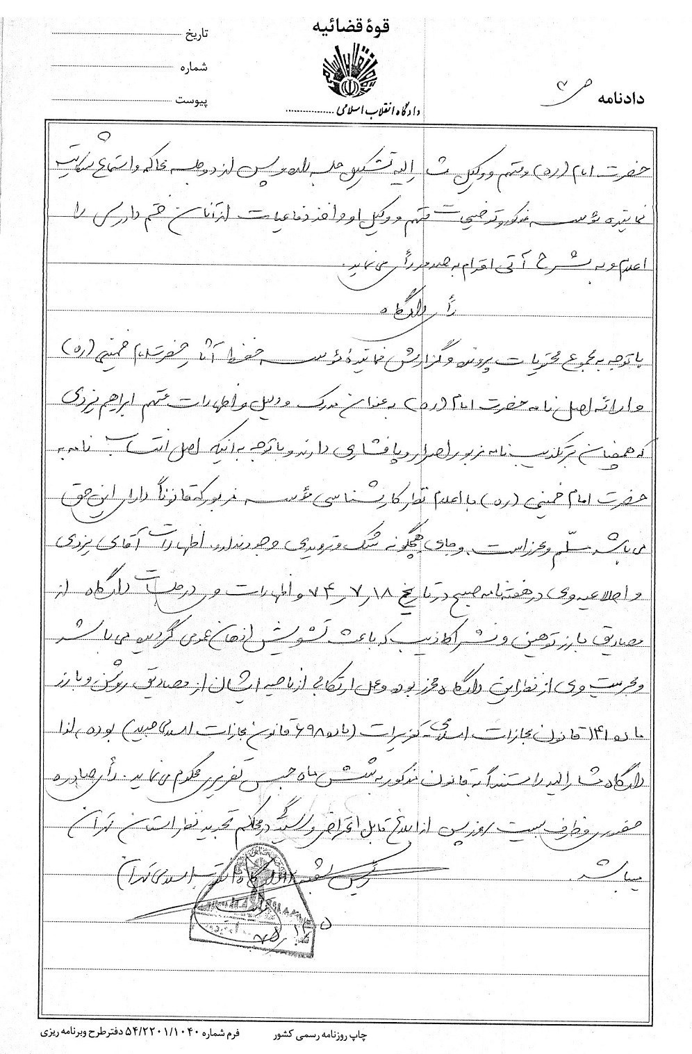 این رأی حدود یک سال بعد در تاریخ 72/4/29 به مؤسسه تنظیم و نشر ابلاغ میشود. آقای حمید انصاری در تاریخ 4 مردادماه طی نامهای مختصر به دادستان تهران مینویسد «با توجه به اهمیت موضوع و وظیفه قانونی این مؤسسه ضمن اعتراض مجدد به قرار صادره بهمنظور پیگیری شکایت مؤسسه از طریق مجاری قانونی و اطلاع از مستندات قرار صادره و رأی شماره 98-71/3/10 شعبه 178 دادگاه کیفری 2 خواهشمند است دستور فرمایید نسخهای از رأی صادره که قاعدتاً متضمن مستندات قانونی آن میباشد را برای مؤسسه ارسال نمایید و این مؤسسه را از دلایل قرار منع تعقیب کسانی که رسماً و علناً اقدام به پخش اعلامیه نموده و با دلایل واهی سعی در زیر سؤال بردن عین دستخط مبارک رهبر کبیر انقلاب در موضوعی بسیار مهم داشتهاند مطلع سازند».