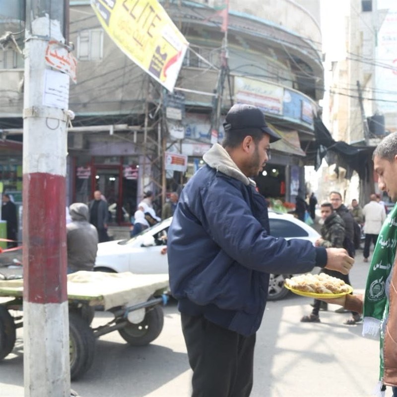 فعالان و کاربران شبکههای اجتماعی تصاویری بهاشتراک گذاشتهاند که نیروهای حماس در حال توزیع شیرینی بین عابران پیاده هستند.