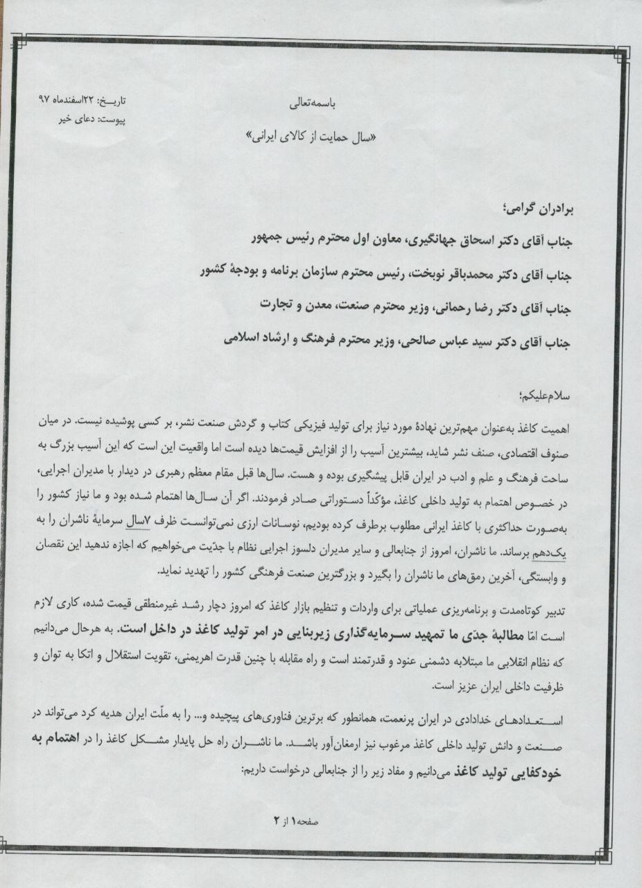 استعدادهای خدادادی در ایران پرنعمت، همان طور که برترین فناوریهای پیچیده و... را به ملّت ایران هدیه کرد میتواند در صنعت و دانش تولید داخلی کاغذ مرغوب نیز ارمغانآور باشد. ما ناشران راه حل پایدار مشکل کاغذ را در اهتمام به خودکفایی تولید کاغذ میدانیم و مفاد زیر را از جنابعالی درخواست داریم:
