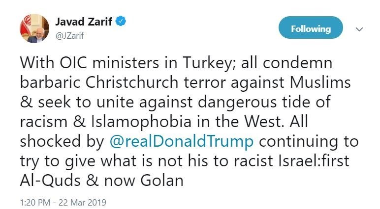 همراه با وزرای امور خارجه سازمان همکاری اسلامی در ترکیه حضور دارم. همگان حادثه تروریستی وحشیانه کرایست چرچ علیه مسلمانان را محکوم کردیم و خواستار اتحاد علیه موج خطرناک نژاد پرستی و اسلام هراسی در غرب شدیم. همچنین همه از تلاش مستمر دونالد ترامپ برای دادن آنچه که حق رژیم نژاد پرست اسرائیل نیست شوکه شدیم: ابتدا قدس شریف و اکنون منطقه جولان در سوریه.
