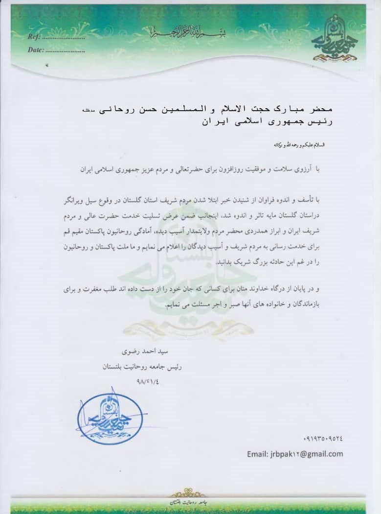 با تأسف و اندوه فراوان از شنیدن خبر ابتلا شدن مردم شریف استان گلستان در وقوع سیل ویرانگر در این استان مایه تاثر و اندوه شد، اینجانب ضمن عرض تسلیت خدمت حضرت عالی و مردم شریف ایران و ابراز همدردی محضر مردم ولایتمدار آسیب دیده، آمادگی روحانیون پاکستان مقیم حوزه علمیه قم برای خدمت رسانی به مردم شریف و آسیب دیدگان اعلام می نمایم و ما ملت پاکستان و روحانیون را در غم این حادثه بزرگ شریک بدانید.