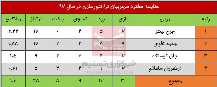 نکته قابل توجه در این میان، بهبود عملکرد تراکتورسازی با نزدیک شدن با پایان سال بوده است. به صورتی که در ابتدای سال گذشته، ارطغرول ساغلام ترکیهای با تیمی نهچندان قدرتمند از 7 دیدار تنها 5 امتیاز کسب کرد اما در ادامه جان توشاک و محمد تقوی به ترتیب از 7 و 9 بازی، 9 و 17 امتیاز کسب کردند.