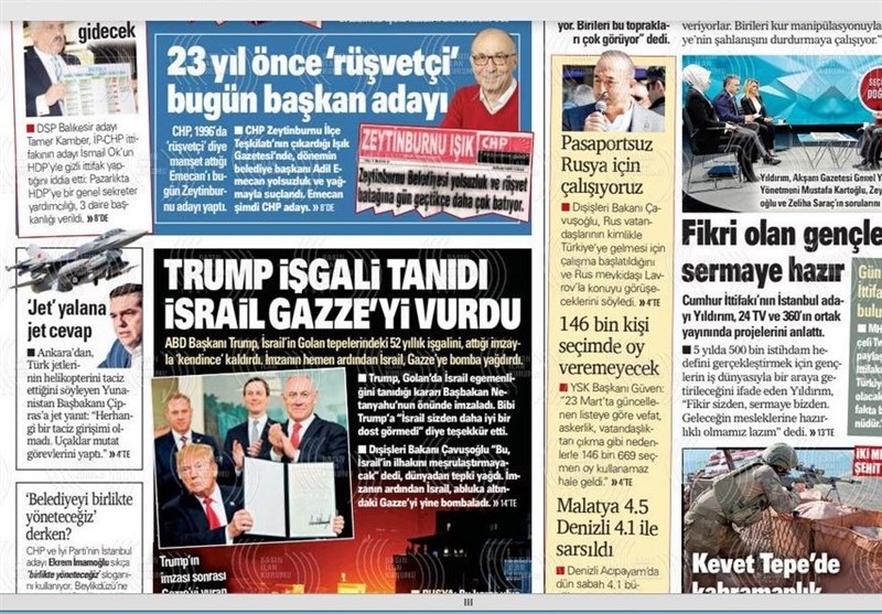 به گزارش گروه بینالملل خبرگزاری تسنیم، بسیاری از روزنامههای ترکیه، امروز در عکس و تیتر صفحه نخست، به رسمیت شناختن حضور رژیم صهیونیستی اسراییل در جولان را برجسته کردهاند.