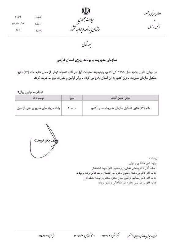 ساسان تاجگردون در گفتوگو با خبرنگار تسنیم در شیراز، اظهار داشت: با ابلاغ محمدباقر نوبخت، رئیس سازمان برنامه و بودجه کشور 5 میلیارد تومان تنخواه گردان از محل منابع ماده 12 قانون تشکیل سازمان مدیریت بحران کشور برای هزینههای ضروری ناشی از سیل به استان فارس اختصاص یافت.