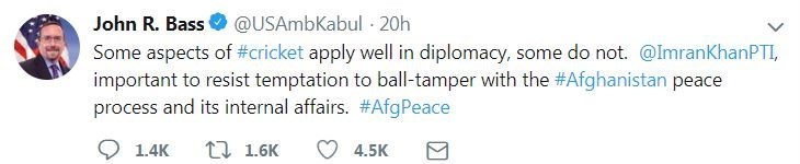 وی در صفحه توییتر خود نوشت: تنها برخی از ابعاد کریکت در زمینه سیاست به خوبی اعمال میشوند، این مهم است که در برابر وسوسه برای مداخله مکارانه در امور داخلی و روند صلح افغانستان مقاومت صورت گیرد.