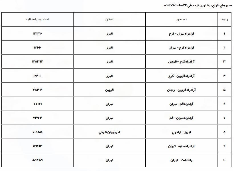 همچنین سهم وسایل نقلیه سنگین 7.3 درصد، اوج تردد بین ساعات 17 الی 18 و کمترین تردد بین ساعات 4 الی 5 صورت پذیرفته که هموطنان عزیز با آگاهی از این موضوع میتوانند ساعات مناسب تری را برای سفر انتخاب نمایند.