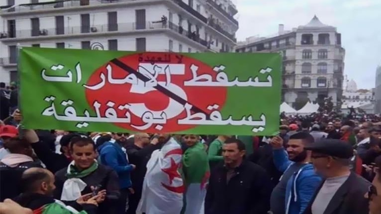 پیرمردی هم در میدان پست مرکزی پلاکاردی را در دست گرفته بود که بهروی آن شعار «سرنگون باد امارات، سرنگون باد بوتفلیقه» نوشته شده بود.