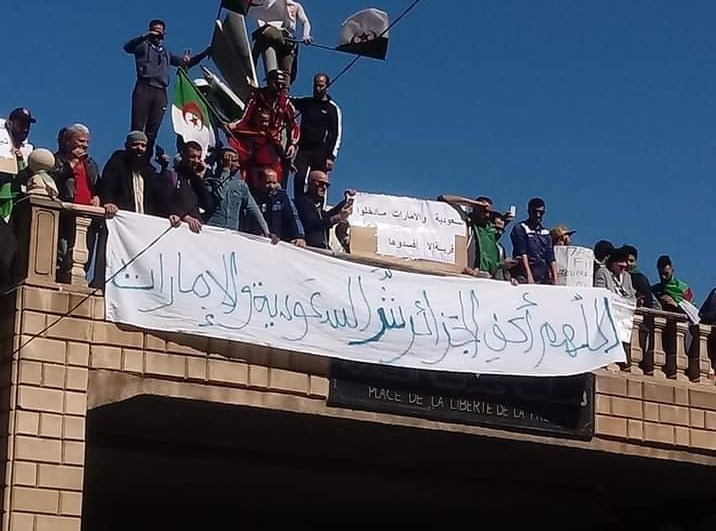 طی این مدتی که از تظاهرات ضددولتی در الجزایر میگذرد، تابلوها و پارچهنوشتههای بزرگی جلب توجه کرد که بهطور خاص رژیمهای امارات و عربستان و تلاشهای آنها برای دخالت در امور الجزایر را هدف قرار داده است. در یکی از این پلاکاردها این چنین نوشته شده است: «خدایا، شر عربستان سعودی و امارات را از الجزایر دور نما»، این تابلو در میدان اودان یکی از مشهورترین میادین تظاهرات الجزایر نصب شده است، از تظاهرکنندگان خواسته شده است شعارهایی بر ضد عربستان و امارات سر دهند.