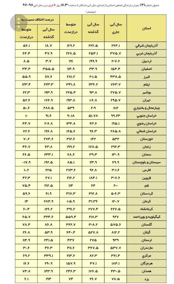 به گزارش گروه استانهای خبرگزاری تسنیم، براساس اعلام دفتر مطالعات پایه منابع آب شرکت مدیریت منابع آب ایران، پربارانترین استانها در سال آبی 97-98 به این شرح است.