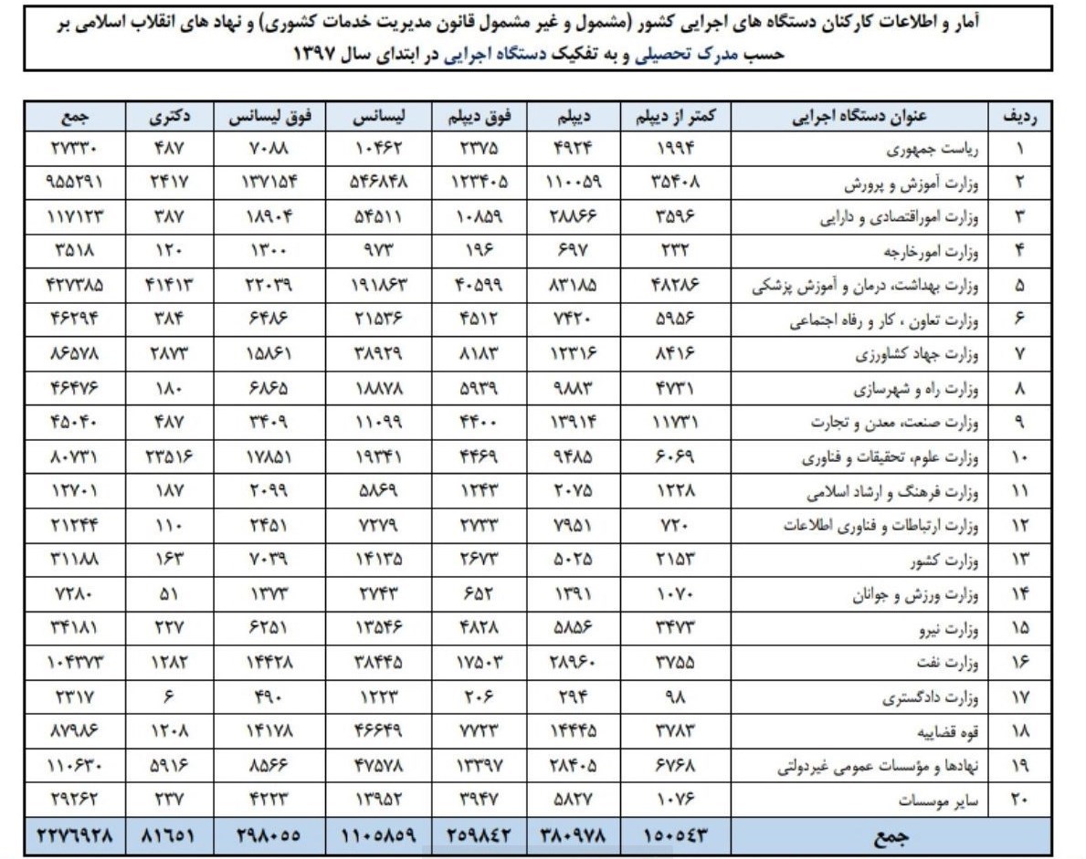 همچنین در جدول زیر تعداد کارمندان دولت به تفکیک مدرک ذکر شده است. بر این اساس 81 هزار کارمند دولت دارای مدرک دکتری بوده که حدود 41 هزار نفر آنها در وزارت بهداشت مشغول به کار هستند. به این ترتیب با توجه به تعداد 427 هزار کارمند مشغول به کار در این وزارت خانه تنها حدود 10 درصد کارمندان وزارت بهداشت دارای مدرک دکتری هستند.
