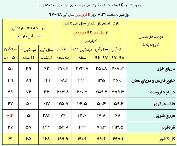 به گزارش خبرگزاری تسنیم از شیراز، براساس آماری که دفتر مطالعات پایه منابع آب ایران اعلام کرده حجم بارش حوضه‌های آبریز کشور از اول مهرماه 97 تا یازدهم فرودین‌ماه 98  معادل 267.1 میلی‌متر است. این مقدار بارندگی نسبت به میانگین 50 ساله (189.9 میلی‌متر) 41 درصد، نسبت به میانگین 11 ساله اخیر (161.6 میلی‌متر) 65 درصد و نسبت به دوره مشابه سال آبی گذشته (99.6 میلی‌متر) 168 درصد افزایش را نشان می‌دهد.