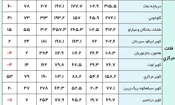 در بین حوضه‌های فرعی فلات مرکزی، حوضه «طشک، بختگان و مهارلو» (412.2 میلی‌متر) بیشترین و حوضه کویر درانجیر (69.7 میلی‌متر) کمترین میزان بارندگی را داشته‌اند.