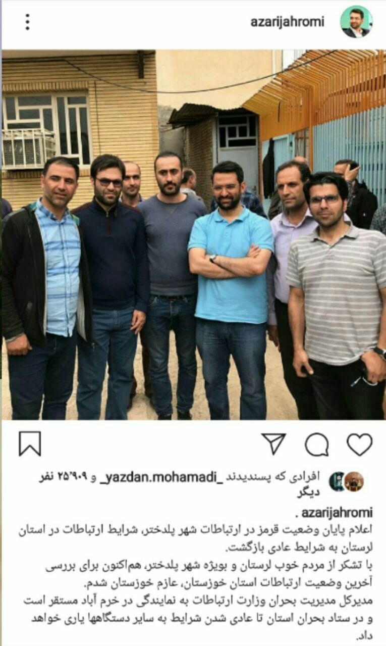 وزیر ارتباطات اظهار داشت: اعلام پایان وضعیت قرمز در ارتباطات شهر پلدختر، شرایط ارتباطات در استان لرستان به شرایط عادی بازگشت. با تشکر از مردم خوب لرستان و بهویژه شهر پلدختر، هماکنون برای بررسی آخرین وضعیت ارتباطات استان خوزستان، عازم این استان شدم.