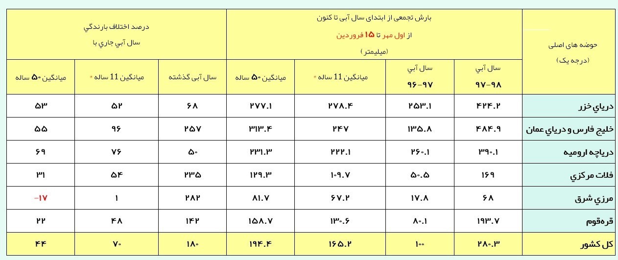 به گزارش خبرنگار اقتصادی خبرگزاری تسنیم، بر اساس آمار رسمی دفتر مطالعات پایه منابع آب شرکت مدیریت منابع آب ایران، ارتفاع کل ریزش‌های جوی از اول مهر 97 تا پانزدهم فروردین 98 (194 روز ابتدایی سال آبی جاری) بالغ بر 280.3 میلی‌متر است.