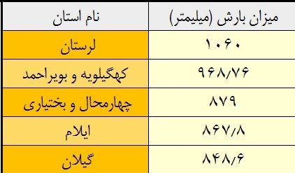 5 استان پربارش کشور به ترتیب میزان بارشها (بهترتیب پربارشترینها) در جدول زیر آورده شده است.