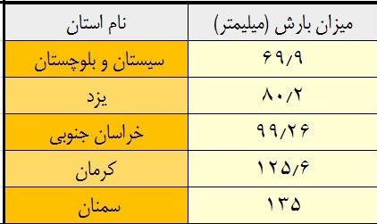 5 استان کمبارش کشور به ترتیب میزان بارشها (بهترتیب کمبارشترینها) در جدول زیر آورده شده است.