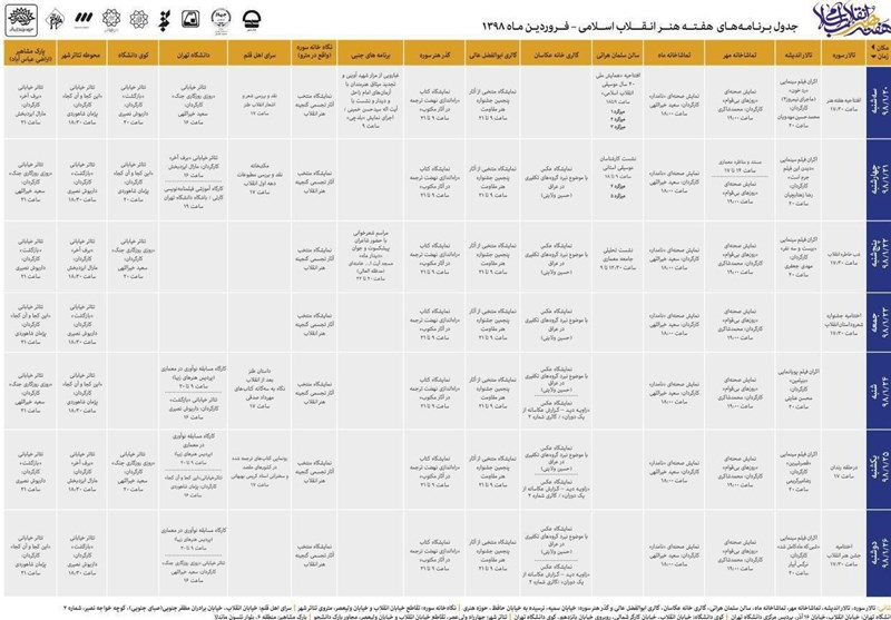 جشن هفته هنر انقلاب، به مناسبت سالروز شهادت شهید مرتضی آوینی از 20 فروردین 98 آغاز شده و در طول یک هفته ضمن مرور مهمترین رویدادهای مرتبط با هنر انقلاب و هنرمندان انقلابی و معرفی چهره سال هنر انقلاب، با نمایش فیلمها، اجرای تئاترها، برگزاری کنسرت، نمایشگاههای تجسمی و... تا تاریخ 27 فروردین ادامه خواهد یافت.