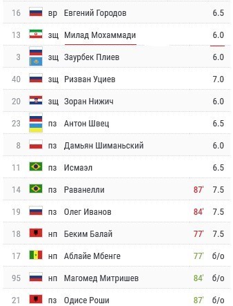 معدل نمرههای فنی دریافتی میلاد محمدی با آمار 1800 دقیقه بازی در 22 هفته فصل جاری لیگ برتر روسیه، یک گلزده و یک پاس گل 6.4 است.