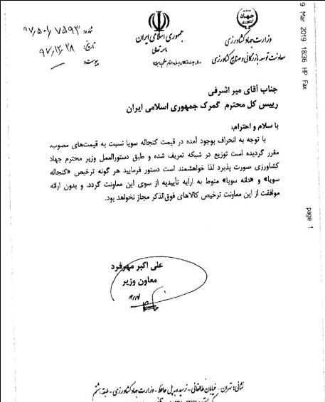 علی اکبر مهر فرد معاون وزیر جهاد کشاورزی با ارسال نامهای به میراشرفی رئیس کل گمرک جمهوری اسلامی ایران نوشت: با توجه به انحراف بوجود آمده در قیمت کنجاله سویا نسبت به قیمتهای مصوب، مقرر گردیده است توزیع در شبکه تعریف شده و طبق دستورالعمل وزیر جهاد کشاورزی صورت پذیرد؛ لذا خواهشمند است دستور فرمایید هرگونه ترخیص کنجاله سویا و دانه سویا منوط به ارائه تاییدیه از سوی این معاونت گردد و بدون ارائه موافقت از این معاونت، ترخیص کالاهای فوق مجاز نخواهد بود.