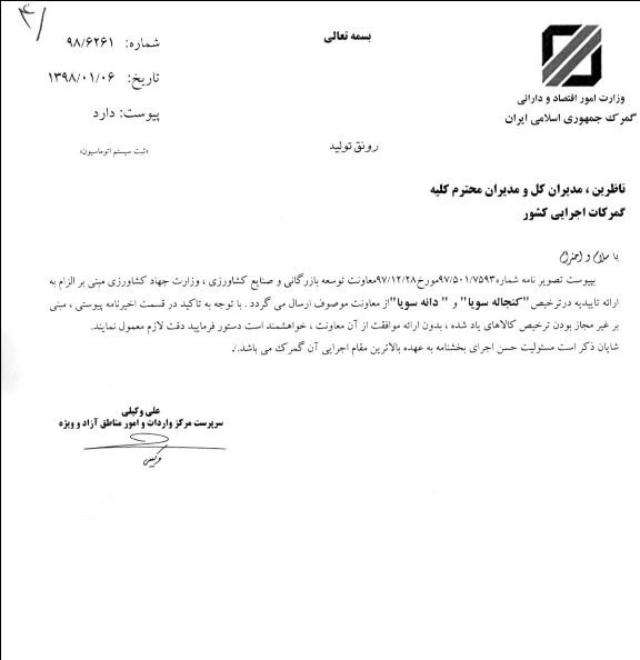بنابراین گزارش، علی وکیلی سرپرست مرکز واردات و امور مناطق آزاد و ویژه گمرک جمهوری اسلامی ایران نیز با ارسال نامهای به ناظران، مدیران کل گمرک نوشت: پیرو نامه معاونت توسعه بازرگانی و صنایع کشاورزی وزارت جهاد کشاورزی مبنی بر الزام به ارائه تاییدیه در ترخیص کنجاله و دانه سویا از معاونت موصوف ارسال میگردد.