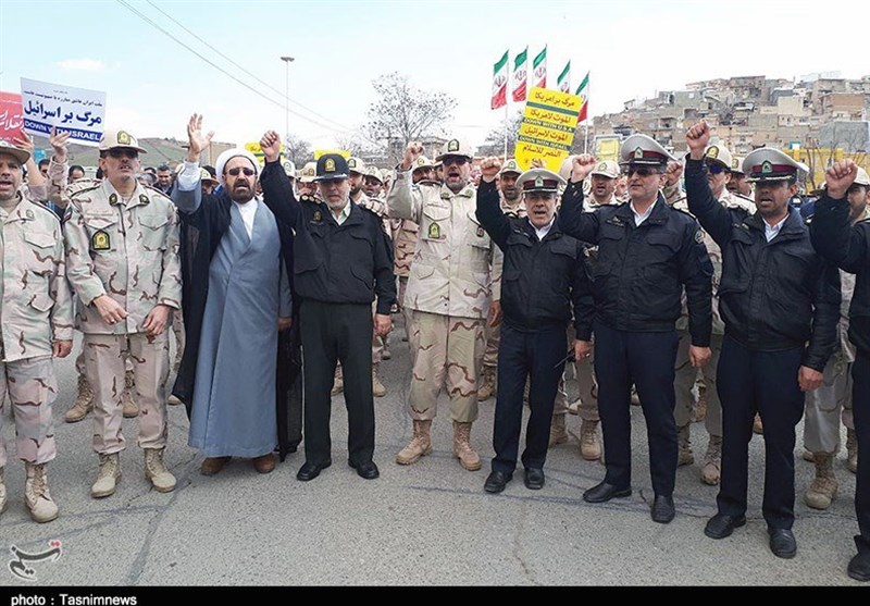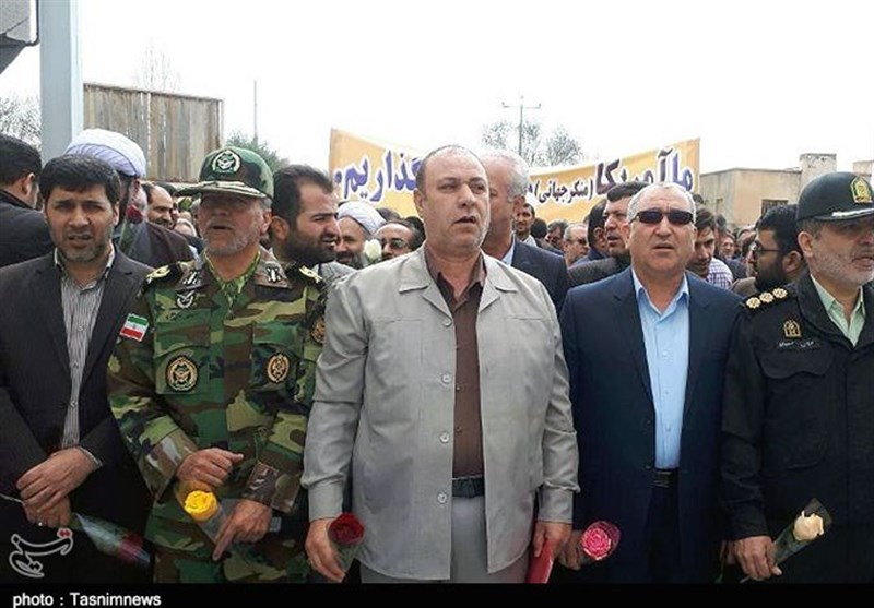 کردستانیهای همیشه در صحنه با سردادن شعارهایی همچون «مرگ بر آمریکا»؛ «مرگ بر آلسعود خائن»؛ «مرگ بر انگلیس»؛ «حمایت از سپاه، حمایت از نظام است»؛ «وای اگر خامنهای حکم جهادم دهد ارتش دنیا نتواند که جوابم دهد» و «برادر سپاهی حمایتت میکنیم»؛ « نه سازش نه تسلیم، نبرد با آمریکا» حمایت از سپاه و انزجار از آمریکای جنایتکار و تروریست را فریاد زدند و بار دیگر ضمن محکومیت آمریکا مبنی بر قرار دادن سپاه در لیست سازمانهای تروریستی با اهدای گل از پاسداران سپاه بیتالمقدس کردستان تجلیل کردند.