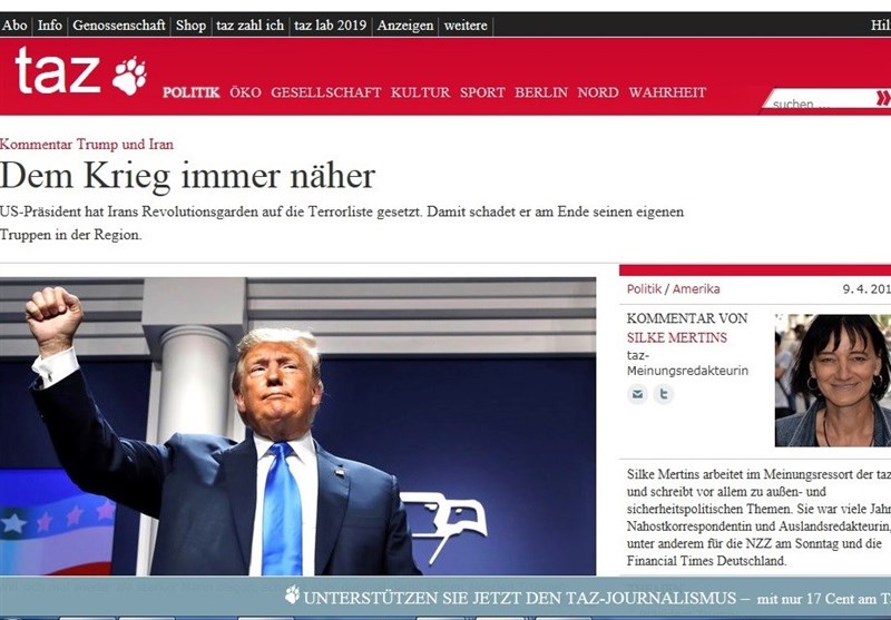 این روزنامه آلمانی در ادامه به اظهارات مختلف بسیاری مقامات داخلی در ایران در حمایت از سپاه پاسداران انقلاب اسلامی اشاره کرده از در معرض خطر قرار گرفتن نیروهای آمریکایی در منطقه در سایه این اقدام ترامپ نوشت.