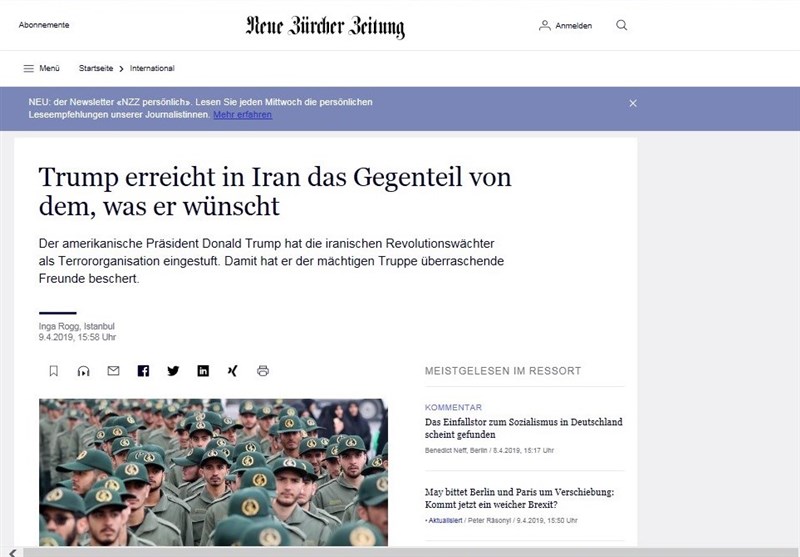 روزنامه سوئیسی "نویه زوریخه سایتونگ" هم در مطلبی نوشت که "دونالد ترامپ" با این اقدام خود علیه سپاه پاسداران نتیجه عکسی را دریافت خواهد کرد.