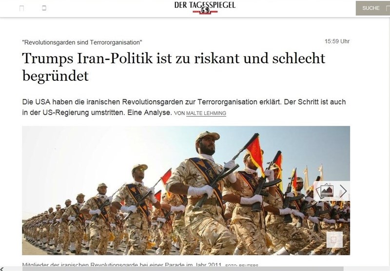 روزنامه "تاگس اشپیگل" آلمان در مطلبی سیاست ترامپ در قبال ایران را بسیار خطرناک دانست که بد توجیه میشود و با اشاره به قدرت و نفوذ بالای سپاه پاسداران انقلاب اسلامی در ایران نوشت: بیش از یک دهه است که درباره تروریستی خواندن سپاه در آمریکا بحث میشود و حالا ترامپ این کار را انجام داده است.