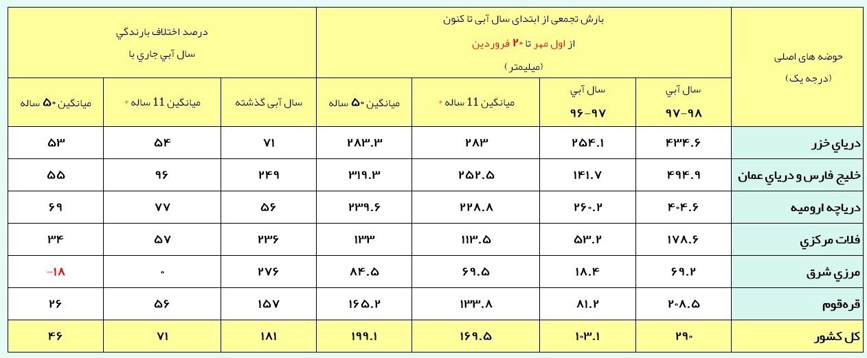 این مقدار بارندگی نسبت به میانگین دورههای مشابه درازمدت (199.1 میلیمتر) 46 درصد افزایش و نسبت به دوره مشابه سال آبی گذشته (103.1 میلیمتر) 181 درصد افزایش نشان میدهد.