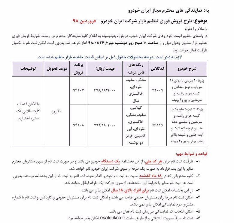 به گزارش خبرنگار اقتصادی خبرگزاری تسنیم، جزئیات طرح فروش تنظیم بازار شرکت ایرانخودرو در قالب یک بخشنامه به نمایندگیهای این شرکت ابلاغ شد. براساس بخشنامه ایرانخودرو به نمایندگیهای فروش در راستای تنظیم قیمت خودروهای این شرکت در بازار؛ بدینوسیله بهاطلاع کلیه نمایندگان میرساند، شرایط فروش فوری تنظیم بازار این شرکت از ساعت 10 صبح روز دوشنبه مورخ 26 فروردین 98 آغاز خواهد شد.