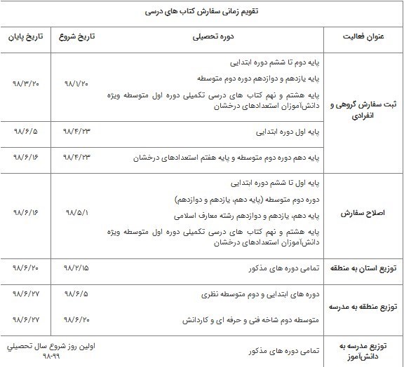 لازم است مدارس ضمن اطلاعرسانی به دانشآموزان به شرح جدول تقویم زمانی زیر نسبت به ثبت سفارش کتاب های درسی سال تحصیلی 99-98 با فرض قبولی دانشآموز در سال تحصیلی جاری اقدام کنند. در صورت عدم موفقیت دانشآموز در پایه فعلی در زمان اصلاح سفارش امکان تغییر پایه وجود خواهد داشت.