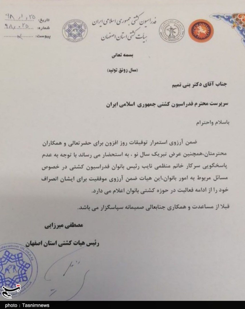 به گزارش خبرگزاری تسنیم از اصفهان، مصطفی میرزایی رئیس هیئت کُشتی استان اصفهان طی مکاتبه‌ای با فدراسیون کشتی جمهوری اسلامی ایران از فعالیت در حوزه بانوان انصراف داد.