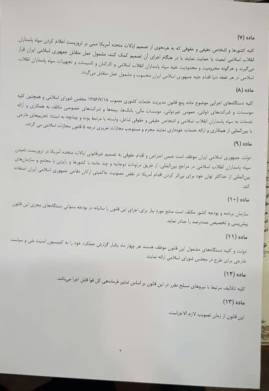 براساس یکی از موارد این طرح، دولت جمهوری اسلامی ایران موظف است در چارچوب مصوبات شورای عالی امنیت ملی، در برابر اقدامات تروریستی نیروهای آمریکایی که منافع جمهوری اسلامی ایران را بهمخاطره میاندازند، اقدامات متقابل و قاطع براساس این قانون را بهعمل آورد.