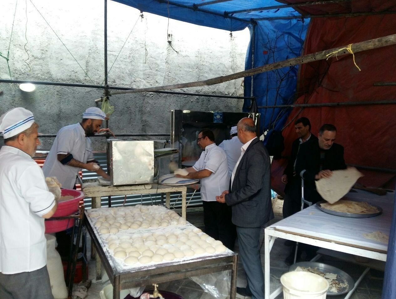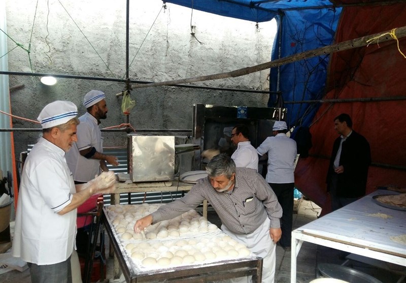 خادمان موکب امام هشتم(ع) صبح تا شب دست به کارند و شاطرها روزی 3 نوبت عوض میشوند؛ زنها هم در مسجد نزدیک موکب نانها را خنک و بستهبندی میکنند.