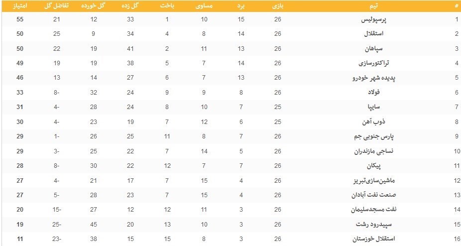 نتایج کامل دیدارهای هفته بیستوششم را در زیر میبینید: