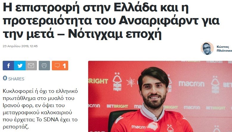 رسانه مطرح ورزشی یونان به بررسی شرایط کنونی و آینده کریم انصاری‌فرد، مهاجم تیم ناتینگهام فارست انگلیس پرداخت.