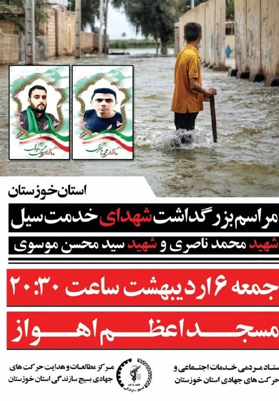 مراسم بزرگداشت شهدای خدمت سیل جمعه 6 اردیبهشت ماه سال جاری در مسجد اعظم اهواز توسط ستاد مردمی خدمات اجتماعی و حرکتهای جهادی استان خوزستان برگزار میشود.