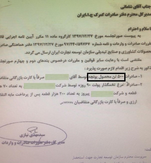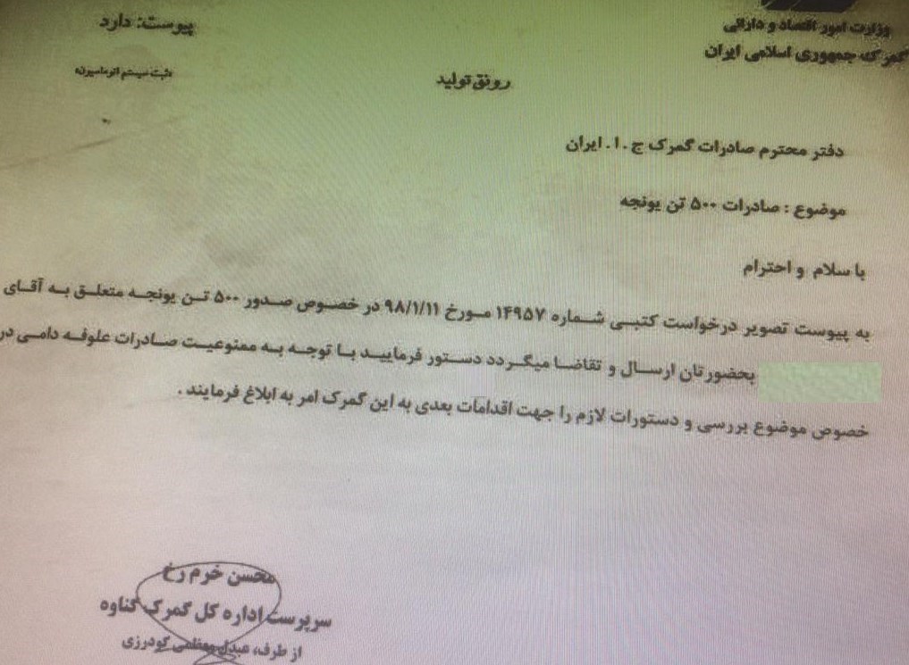 همچنین در ادامه این مکاتبات، نامهای از سوی سرپرست گمرک گناوه به مدیر کل صادرات گمرک ایران برای تعیین تکلیف صادرات 500 تن یونجه با توجه به ممنوعیت صادرات علوفه دامی صادر شده است.