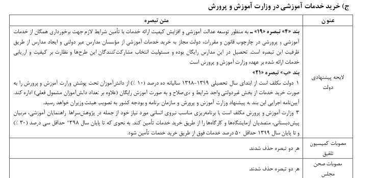 مرکز پژوهشهای مجلس اشاره میکند: لایحه بودجه سال 98 در هفت تبصره به حوزه آموزش و پرورش پرداخته است که از مهمترین این تبصرهها عبارتند از تبصره 19 و تبصره 21 با موضوع اصلاح ساختار اداری وزارت آموزش و پرورش و خرید خدمات آموزشی مورد نیاز این وزارتخانه از بخش غیردولتی.