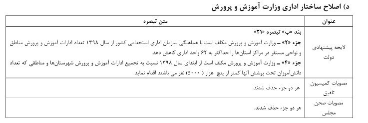 بر اساس همین ماده حذف واحدهای غیرضرور،کاهش سطوح مدیریت،کاهش پستهای سازمانی، انحلال و ادغام سازمانها بر اساس مصوبه شورای عالی اداری است و تنها در مواردی که مؤسساتی بهموجب قانون تشکیل شده باشند انحلال، انتزاع و ادغام آنها نیازمند مصوبه مجلس است پیش از این نیز شورای عالی اداری مصوباتی را در خصوص اصلاح ساختار اداری دستگاههای اجرایی از جمله وزارت آموزش و پرورش داشته که در هیچ کدام از آنها "اصلاح نظام اداری" را نیازمند مصوبه مجلس شورای اسلامی ندانسته است.