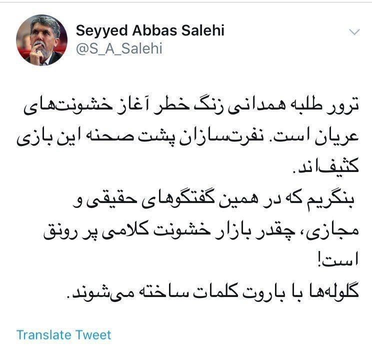 سیدعباس صالحی وزیر فرهنگ و ارشاد اسلامی در توئیتی نسبت به این اتفاق واکنش نشان داد و نوشت: «ترور طلبه همدانی زنگ خطر آغاز خشونتهای عریان است. نفرتسازان پشت صحنه این بازی کثیفاند. بنگریم که در همین گفتگوهای حقیقی و مجازی، چقدر بازار خشونت کلامی پررونق است! گلولهها با باروت کلمات ساخته میشوند.»