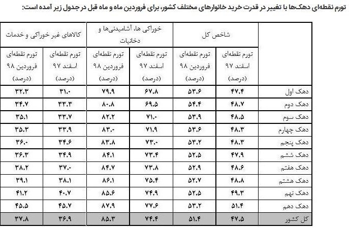 بر اساس این جدول شاخص کل تورم نقطه ای اسفند 97 در کل کشور 47.5 درصد و در فروردین ماه امسال 51.4 درصد گزارش شده که از این میزان تورم نقطه ای دهک اول 53.6 درصد و دهک دهم 53.2 درصد بوده است.