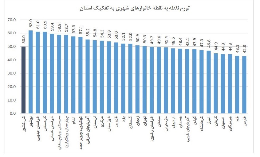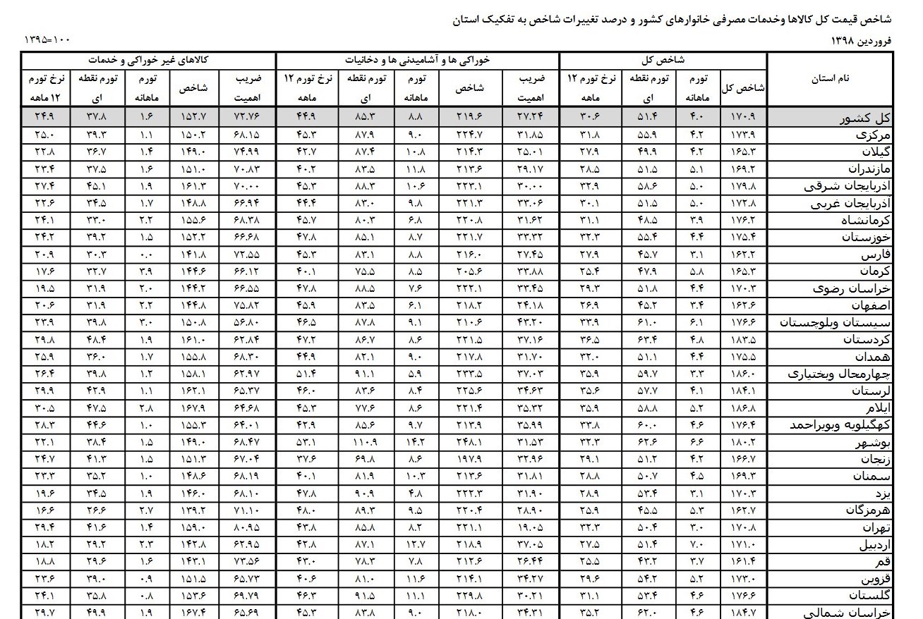 به گزارش خبرنگار اقتصادی خبرگزاری تسنیم، در فروردین ماه ١٣٩٨ عدد شاخص کل برای خانوارهای کشور (100=١٣٩٥) به 170.9 رسید که نسبت به ماه قبل 4 درصد افزایش نشان می­دهد. در این ماه بیشترین نرخ تورم ماهانه خانوارهای کشور مربوط به استان اردبیل با 7 درصد افزایش و کمترین نرخ تورم ماهانه مربوط به استان تهران با 3 درصد افزایش می­‌باشد. درصد تغییر شاخص کل نسبت به ماه مشابه سال قبل (تورم نقطه به نقطه) برای خانوارهای کشور ٥١.٤ درصد می­باشد. بیشترین نرخ تورم نقطه به نقطه مربوط به استان کردستان (63.4 درصد) و کمترین آن مربوط به استان قم (43.2 درصد) است. یعنی خانوارهای ساکن استان کردستان به طور متوسط 12 درصد بیشتر از میانگین کل کشور و خانوارهای ساکن استان قم به طور متوسط  8.2 درصد کمتر از میانگین کل کشور نسبت به فروردین ١٣٩٧ برای خرید یک «مجموعه کالا و خدمات یکسان» هزینه کرده اند. نرخ تورم دوازده ماهه منتهی به فروردین ماه ١٣٩٨ برای خانوارهای کشور به عدد 30.6 درصد رسید. بیشترین نرخ تورم دوازده ماهه مربوط به استان کردستان (٣٦.٥ درصد) و کمترین آن مربوط به استان­ کرمان (25.4 درصد) است. شکاف نرخ تورم دوازده ماهه استان ها در فروردین ماه 11.1 درصد است که نسبت به ماه قبل 1 واحد درصد افزایش نشان می­دهد.
