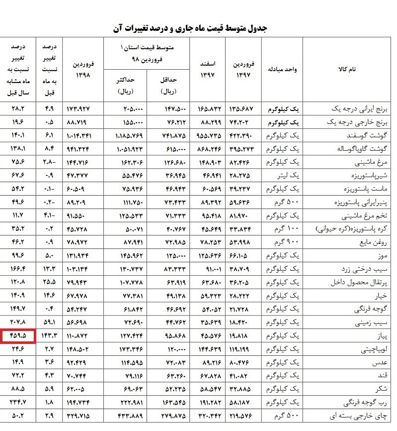 بیشترین افزایش قیمت نسبت به ماه مشابه سال قبل (فروردین ١٣٩٧) مربوط به اقلام «پیاز» با 459.5 درصد افزایش، «رب گوجه فرنگی» با ٢٣٤.٧ درصد افزایش، «سیب زمینی» با ٢٠٧.٨ درصد افزایش، «سیب درختی زرد» با ١٦٦.٤ درصد افزایش، «گوجه فرنگی» با ١٤٩.٧ درصد افزایش و «خیار» با ١٤٠.٩ درصد افزایش است.
