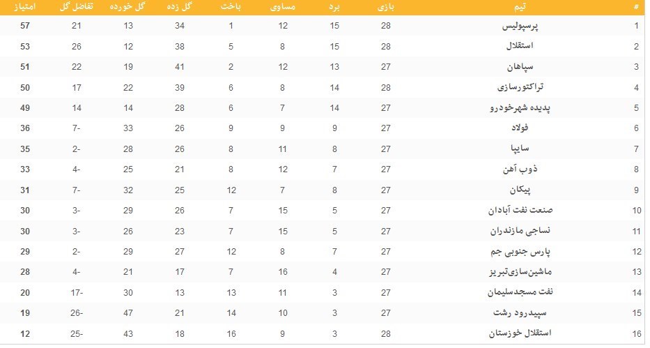 جدول ردهبندی لیگ برتر در پایان دو بازی امروز در زیر آمده است: