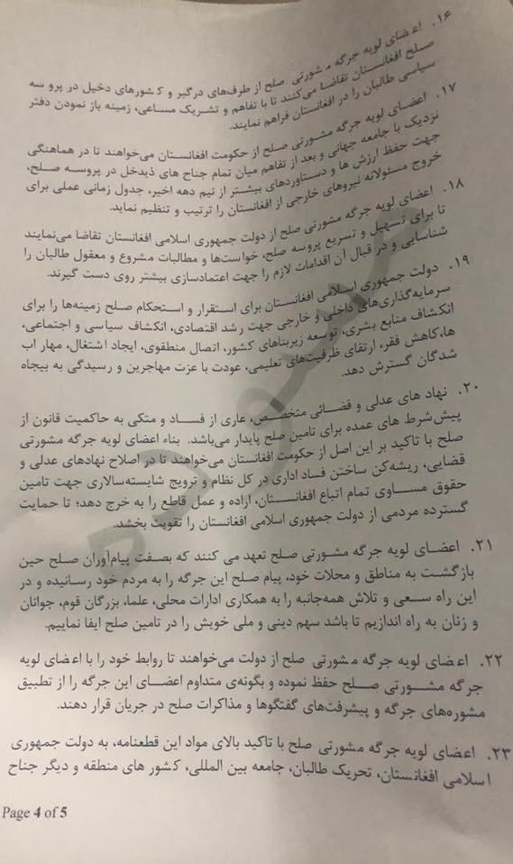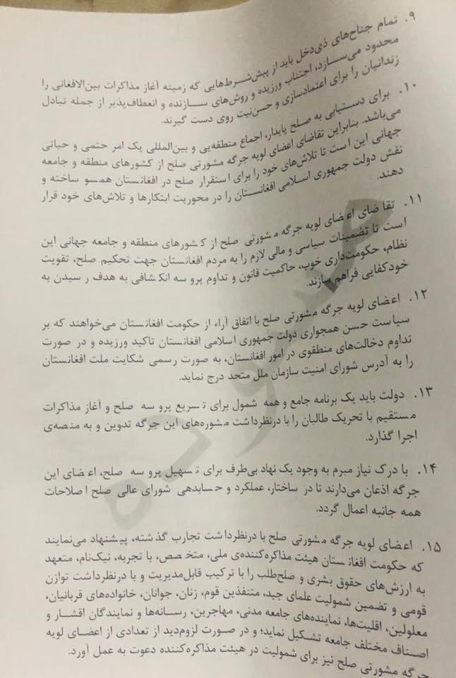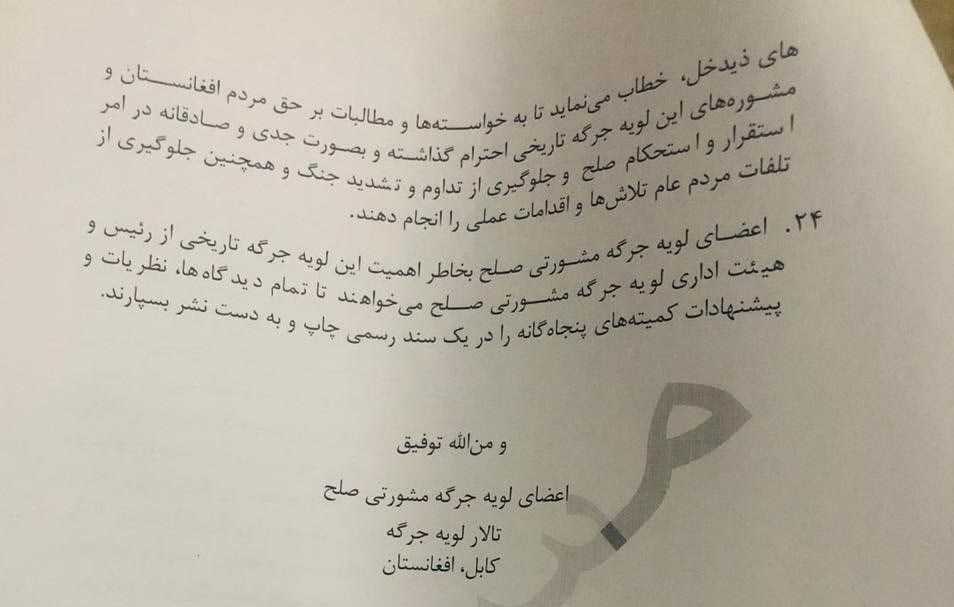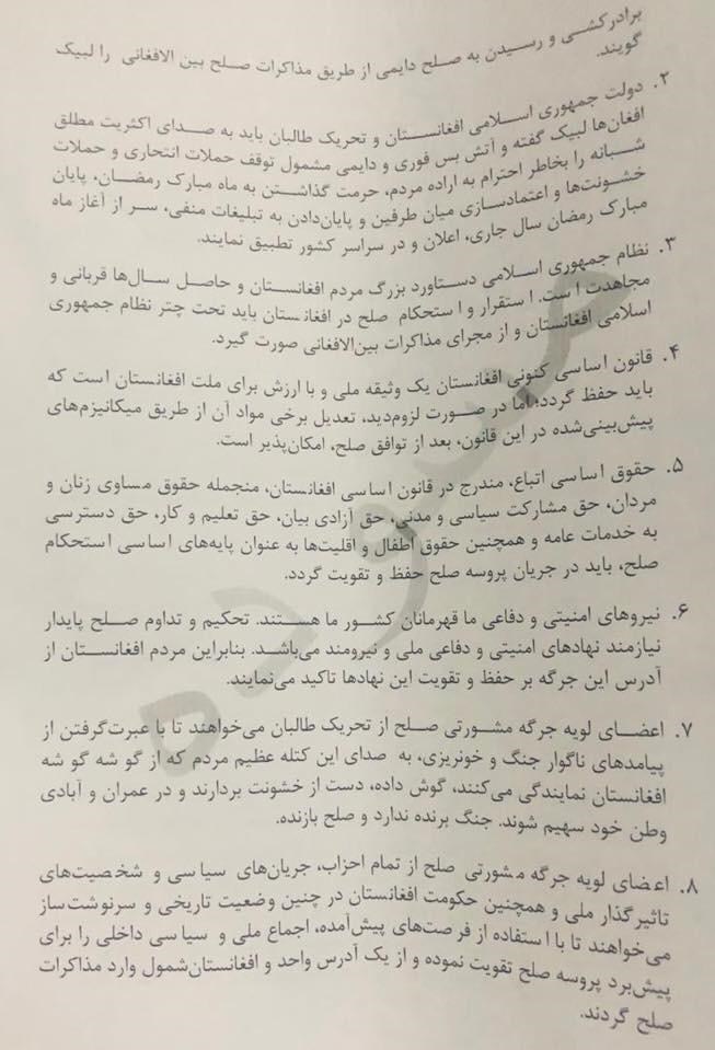 جرگه همچنین از دولت افغانستان، احزاب و جریانهای سیاسی خواست تا از یک موضع واحد به روند صلح افغانستان وارد شوند.