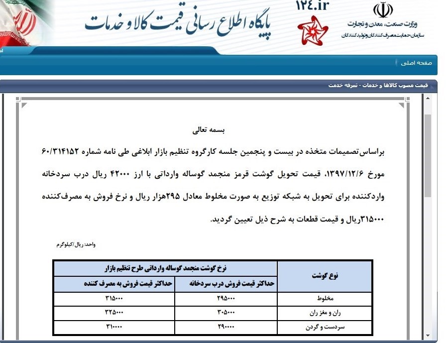 در پایگاه اطلاعرسانی قیمت کالا و خدمات این سازمان اقدام به درج قیمت انواع گوشت قرمز کرده است که هیچ یک از این قیمتها در بازار مشاهده نمیشود، بهطور مثال قیمت هر کیلوگرم گوشت گوسفندی تنظیمبازاری در این سامانه 42 هزار و 400 تومان تا 44 هزار و 400 تومان و گوشت گرم و مخلوط گوساله 31 هزار و 500 تومان، ران و مغز ران 32 هزار و 500 تومان و سردست و گردن 31 هزار تومان است.